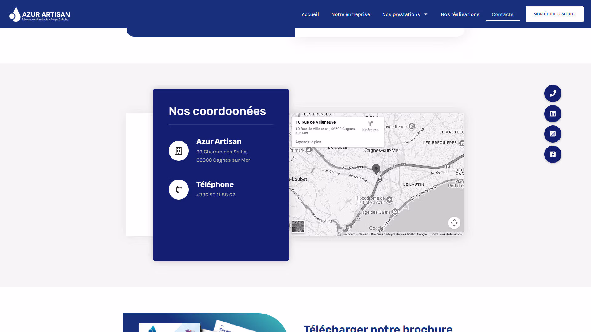 Résultat : un site professionnel et ergonomique qui met en valeur 10 ans d’expérience, améliore la génération de leads qualifiés et renforce la présence locale d’Azur Artisan sur la Côte d’Azur.
