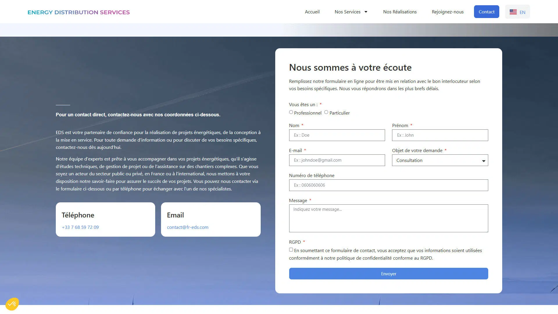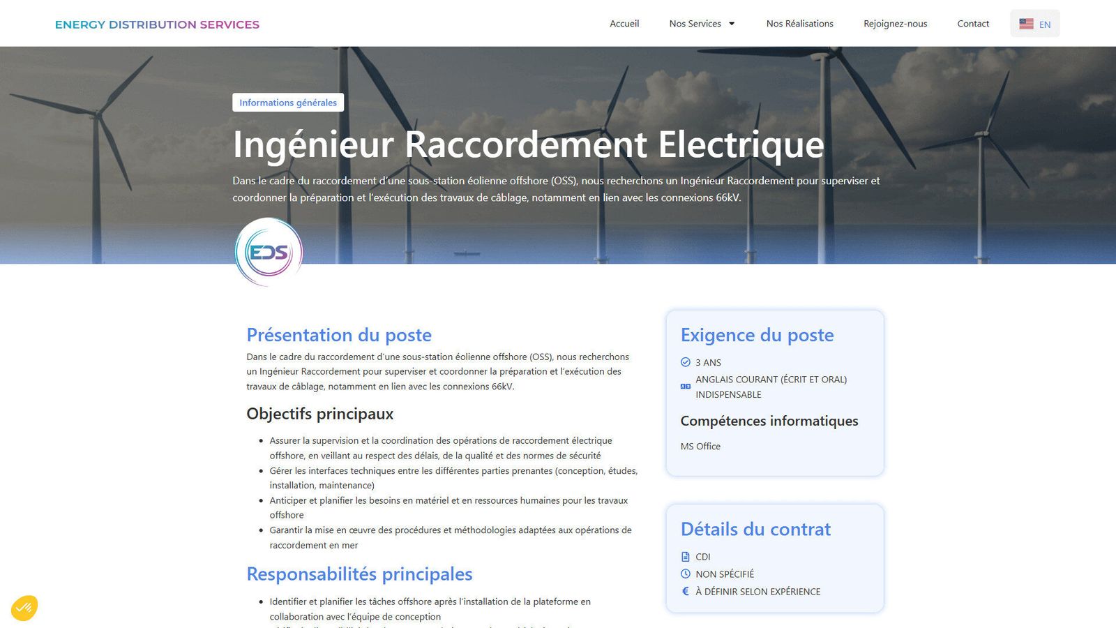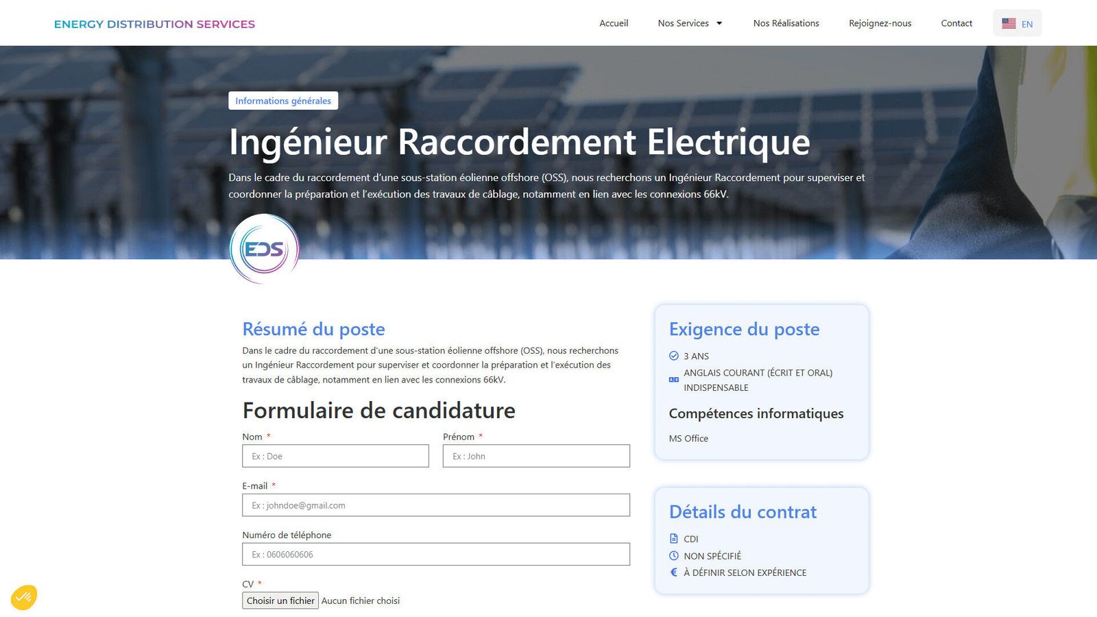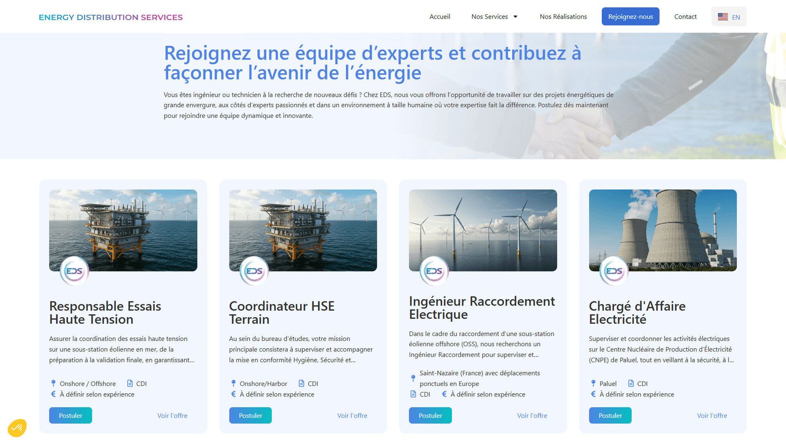 Energy Distribution Services, acteur actif dans la distribution et les services énergétiques en France et en Europe, souhaitait moderniser son site web. L’objectif : proposer une plateforme bilingue (FR / EN) professionnelle, reflétant son expertise, ses partenariats internationaux, et intégrant une nouvelle fonctionnalité : la gestion d’offres d’emploi interne, pour permettre aux gérants de publier des postes, et aux candidats de postuler directement en ligne.